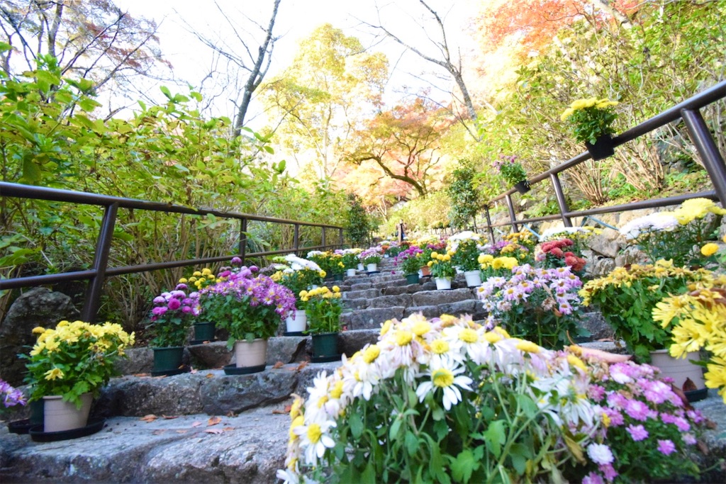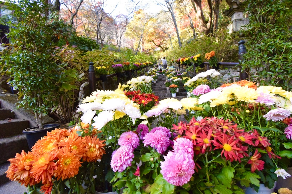 2023年から新たに始まったのが、石段「嵐の坂」を色とりどりの菊で満たす「錦秋菊回廊」だ。境内の石段に、数百鉢もの菊の鉢植えがずらりと並び、期間中は誰でも自由に通り抜けられる。花のすぐそばで写真を撮ることもでき、長谷寺の秋にもうひとつ鮮やかな彩りを添える催しとなっている。