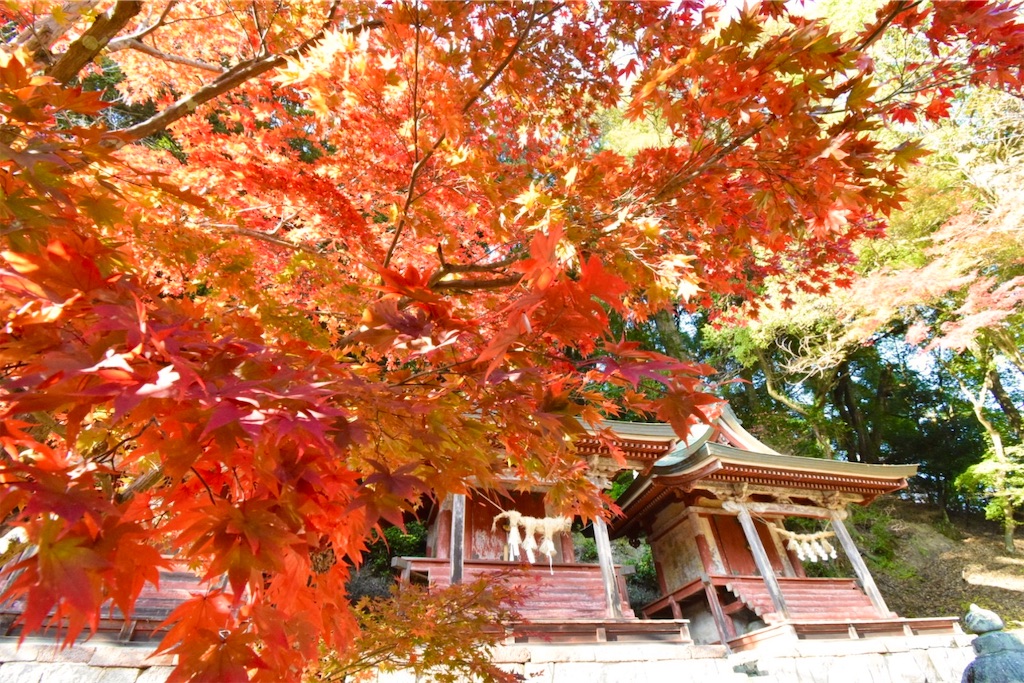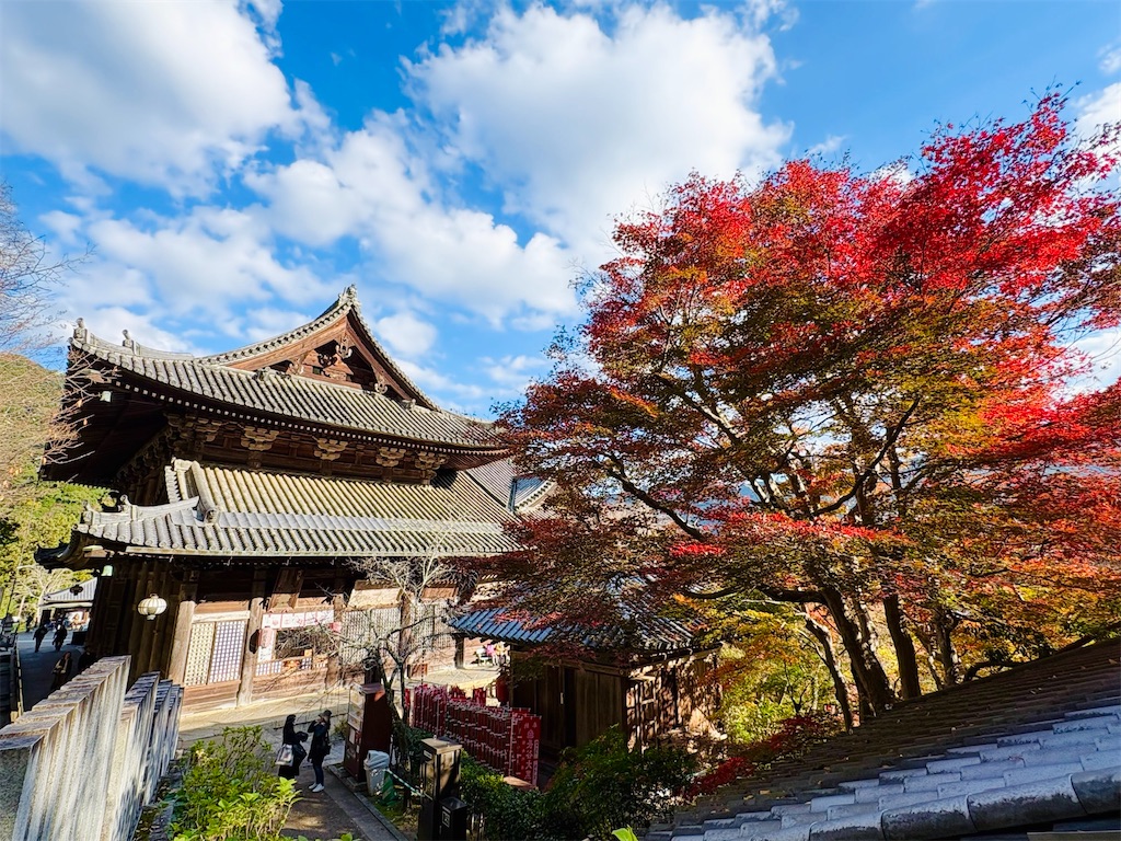 紅葉が頭上から降りそそぎ、朱塗りの社殿の屋根に柔らかく重なる景色は、長谷寺の中でも最も絵画的な一場面。古い信仰の匂い、森の湿り気、そして色づく葉の気配。そのすべてが折り重なって、静かで深い時間をつくりあげている。