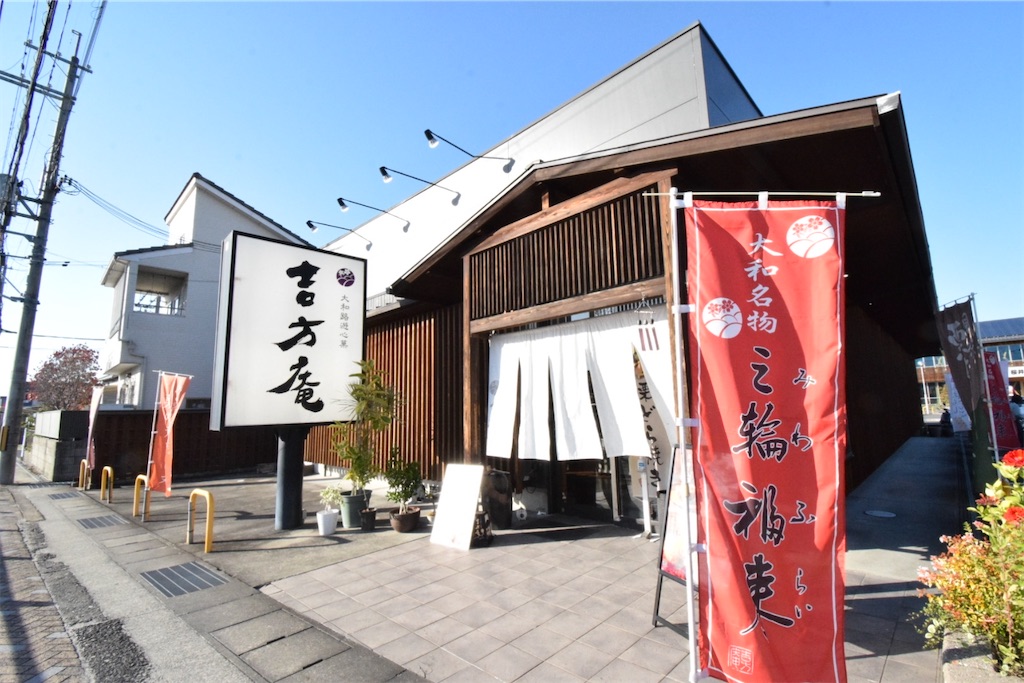 そして驚くほど広い駐車場。その奥に、秀麗な三輪山の姿が見える。吉方庵の菓子は、この山の気配をまとっている。