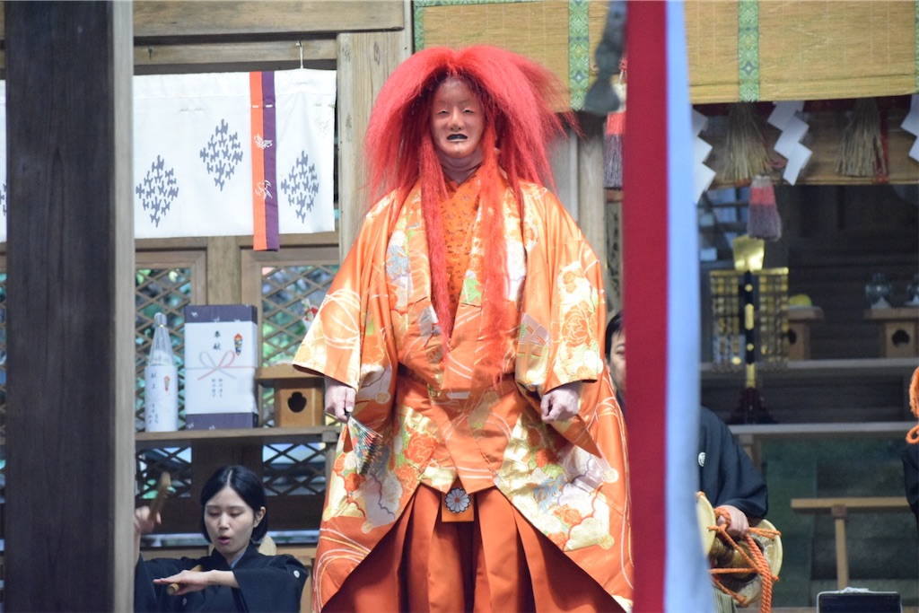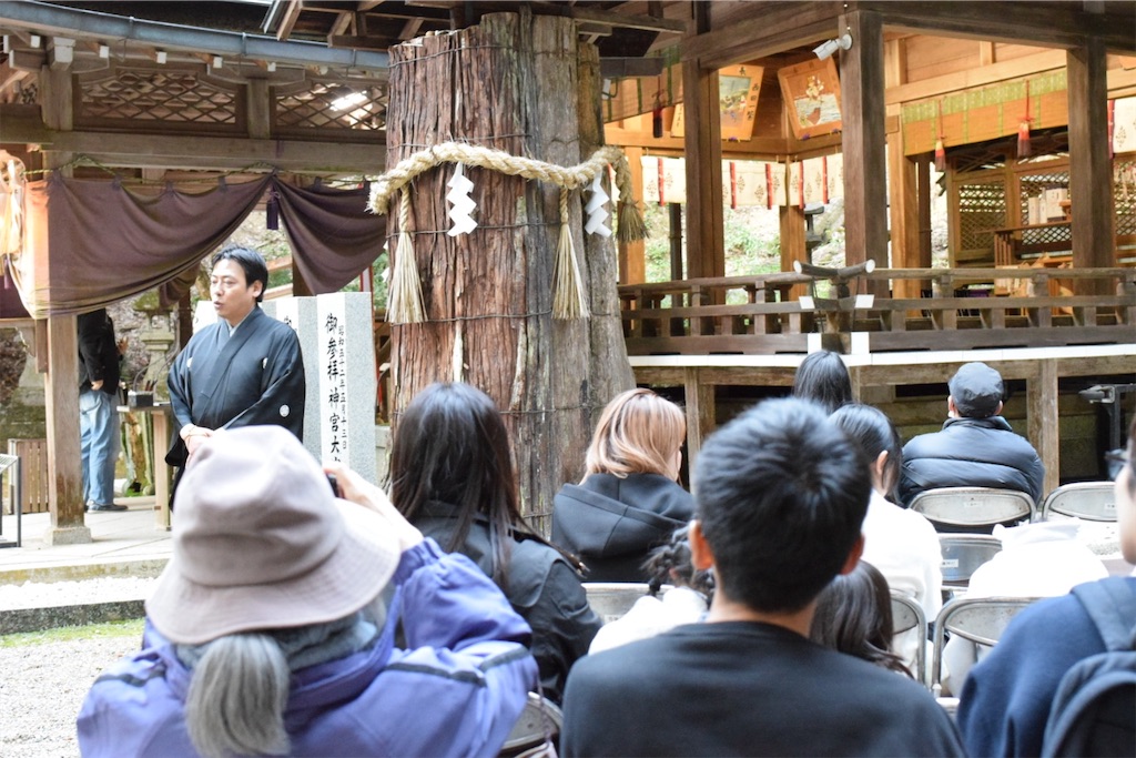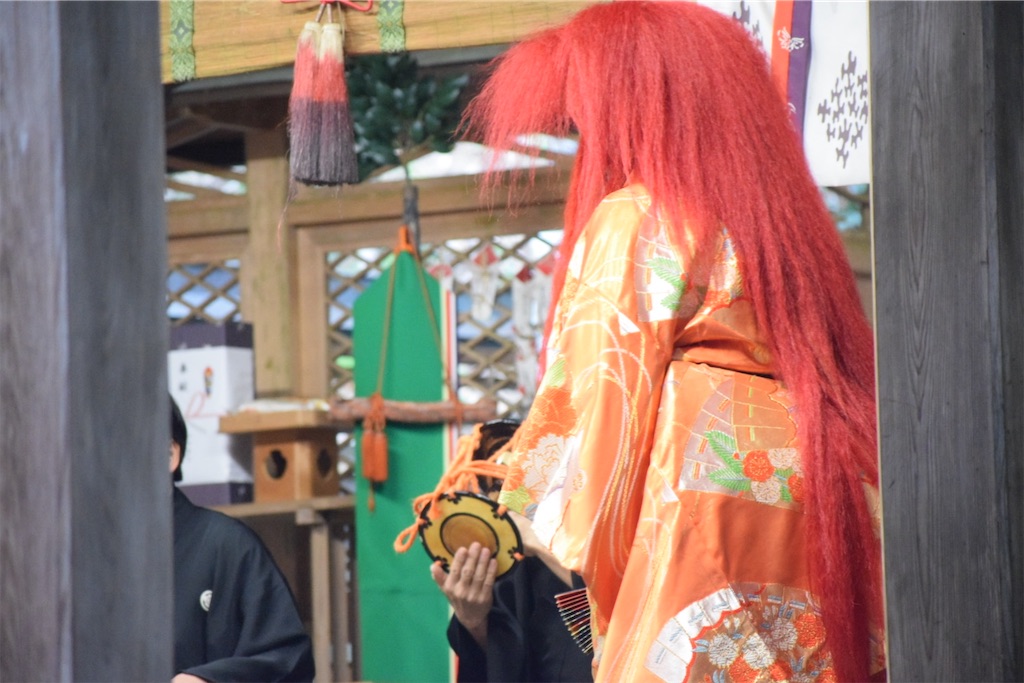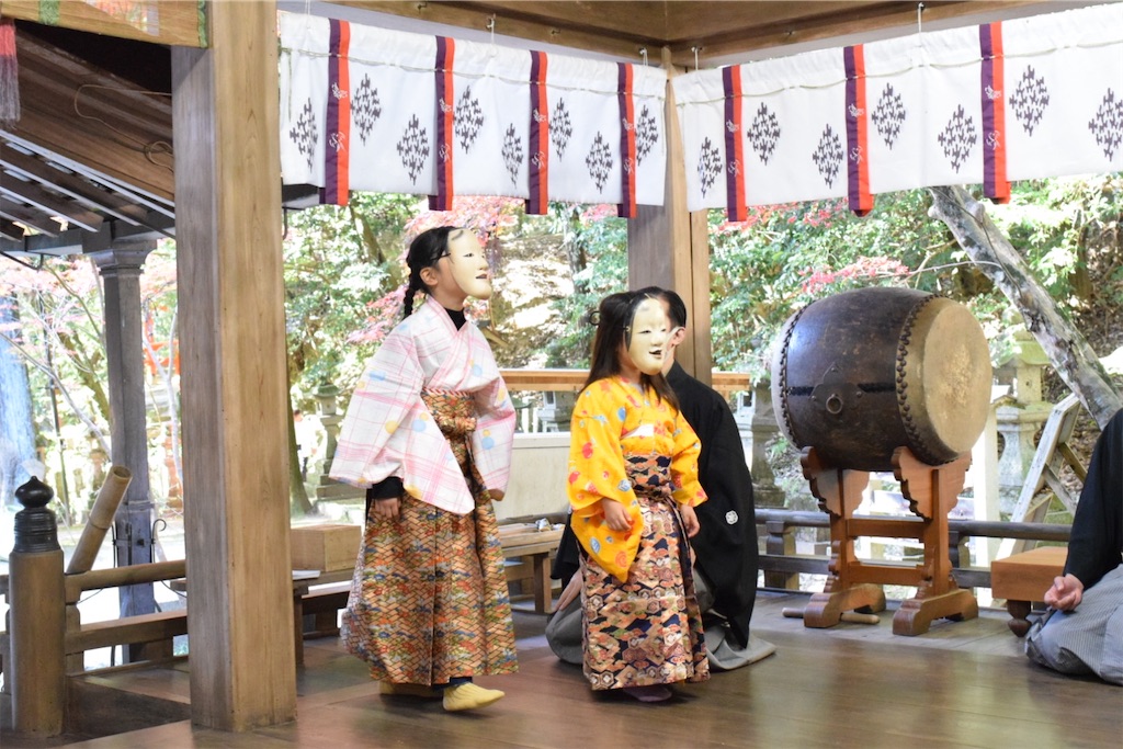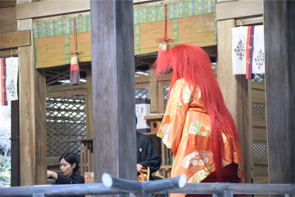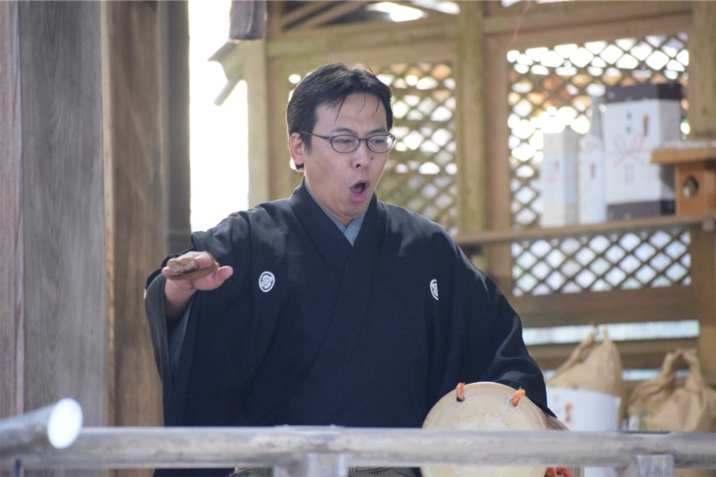そのため、一歩踏み出すだけで動作が静かになり、慎重になる。その姿を見て、初めて「能面の無表情とは、役者が表情を消すためではなく、世界の見え方を変えるためのものだったのか」と感じた。能面をつけた子どもたちの歩みはゆっくりで、そのぎこちなささえも、この拝殿の空気には不思議と馴染んでいた。