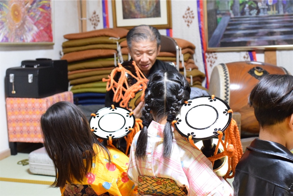 小鼓や大鼓は桜の木をくりぬいた胴に馬皮を張ったもの。子どもが手に持つと、自然と気持ちも引き締まるようだ。