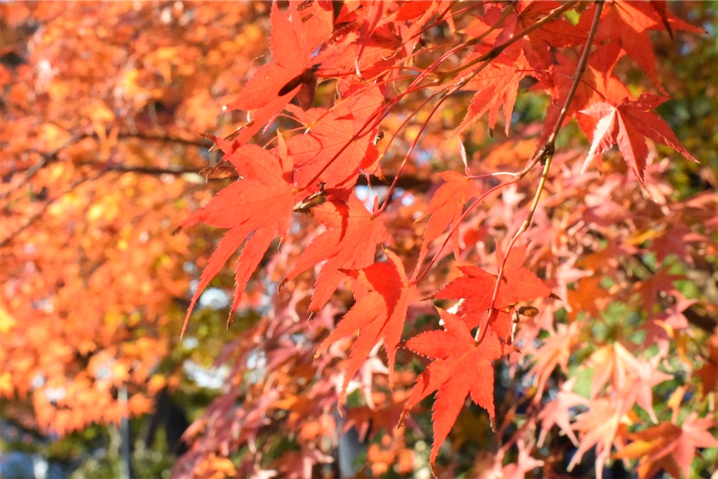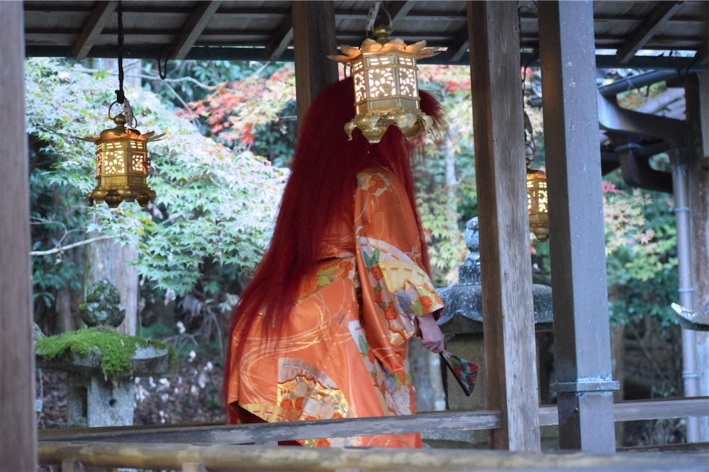 扇を広げる動きはゆっくりだが、鮮やかな衣装と紅葉の背景があいまって、いつまでも残像が残るようだった。