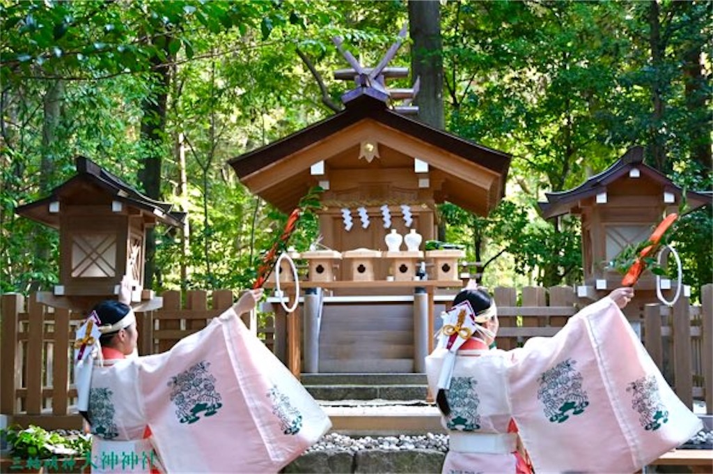 美酒で名高い三輪の神の社よ。夜明けの門を押し開いて、帰るがよい。三輪の社の門を。