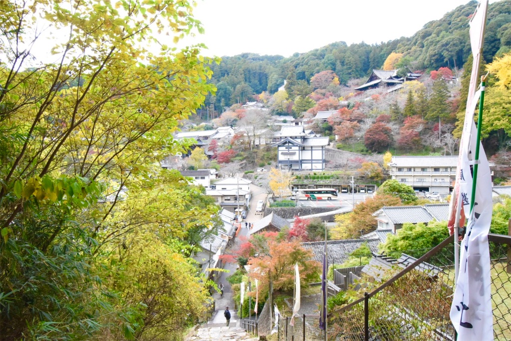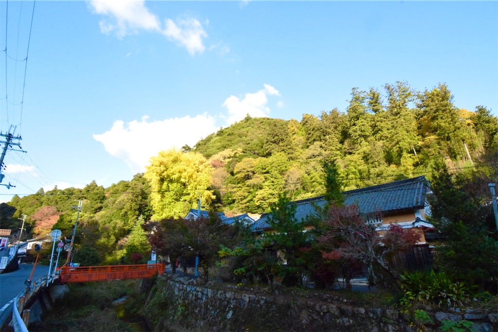 振り返ると、初瀬川の細い流れが赤い欄干の橋をくぐり抜けていく。川面に落ちた木の影が風に合わせて揺れて、それが山の緑と混ざり合って、少しだけ記憶の奥を見るような気持ちになる。